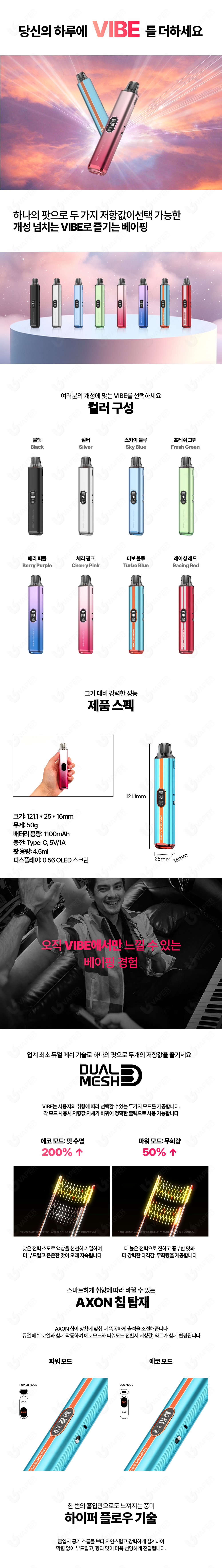 디자인, 성능, 편의성 모두 훌륭한 올인원 베이핑 디바이스를 찾고 있다면 VIBE는 정말 추천할 만합니다. 매일 다른 무드, 다른 느낌으로 나만의 베이핑을 즐기고 싶은 분들에게 딱 맞는 제품이에요.